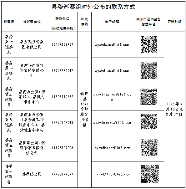 本轮巡察时间50天左右,期间设立专门联系电话、接收短信手机、电子邮箱、邮政信箱等信访举报方式,主要受理反映被巡察单位领导班子及其成员、其他县管干部、下一级单位主要负责人和重要岗位人员的举报和反映,重点是关于违反政治纪律、组织纪律、廉洁纪律、群众纪律、工作纪律和生活纪律等方面。此外,专门开通“南阳市巡察监督智慧平台”,广大干部群众可以直接扫描二维码反映情况。县委巡察组受理信访时间截止到2025年8月27日。(苏帅夺)