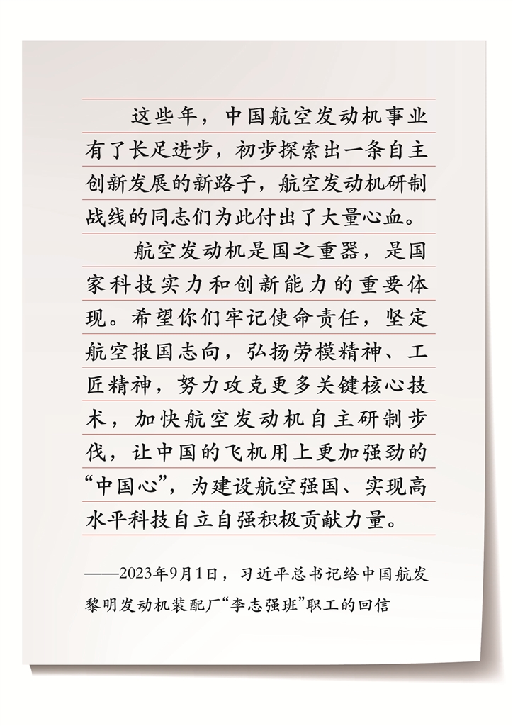 无论是十年前的面对面交流,还是十年后的书信往来,都是一段宝贵经历。“习近平总书记始终关心奋战在航空发动机科研生产一线的普通劳动者,让我们既温暖又振奋。”对于有幸参与其中的“李志强班”装配修理钳工张鹏飞而言,不变的是习近平总书记对航空发动机事业的期待、鼓励和厚望,变化的是航空发动机事业取得了长足进步,初步探索出一条自主创新的新路子,“这与科研战线同志们付出的大量心血密不可分”。