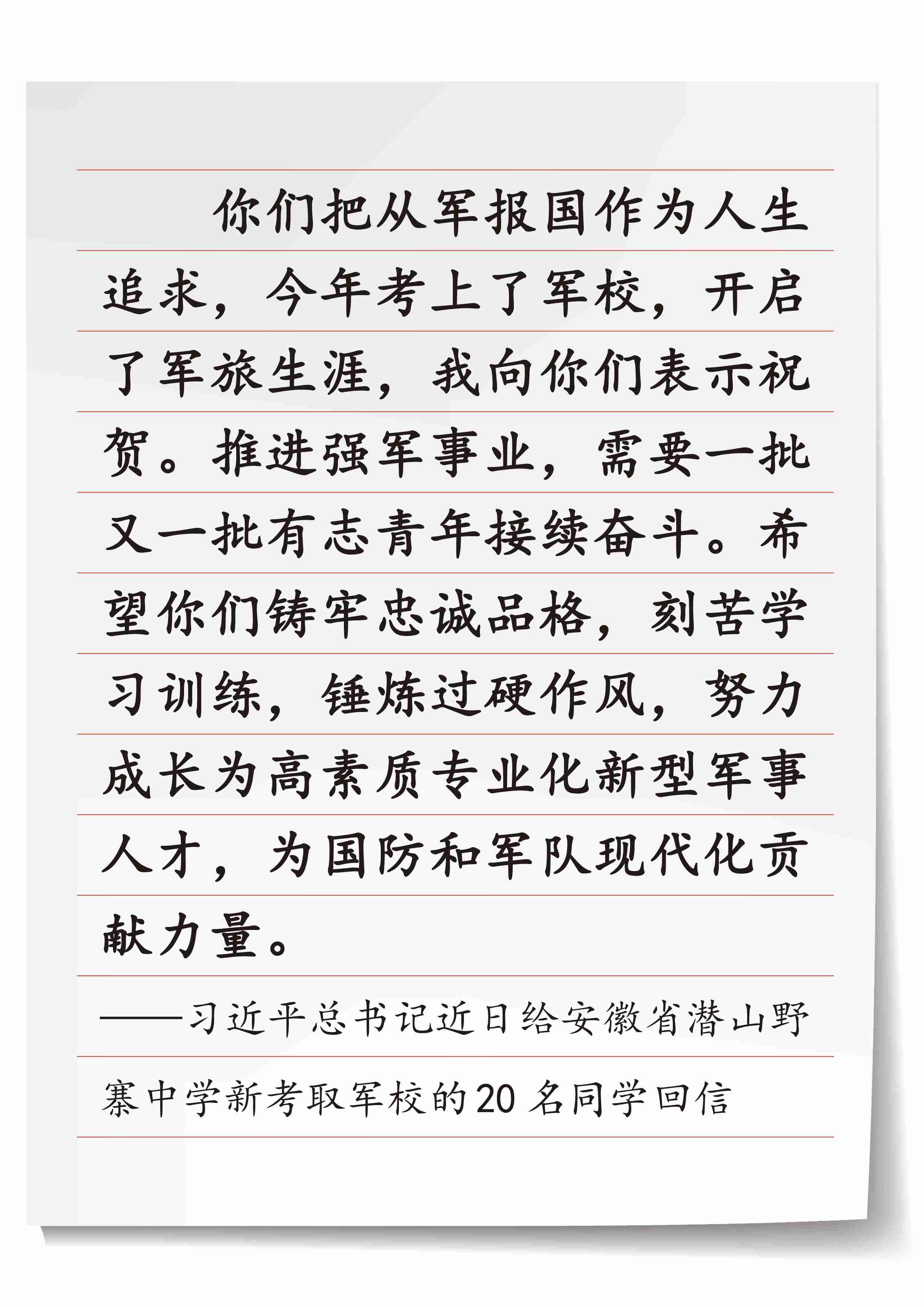 少年自有凌云志,横刀立马定山河。今年,野寨中学770名毕业生中,有133名报考军校,几乎每6人就有1人如此。其中20名毕业生分别被9所军校录取,创历史新高。近日,这20名同学给习近平总书记写信,表达献身国防、矢志强军的信念和决心。开学之际,他们惊喜地收到了来自习近平总书记的亲切勉励。