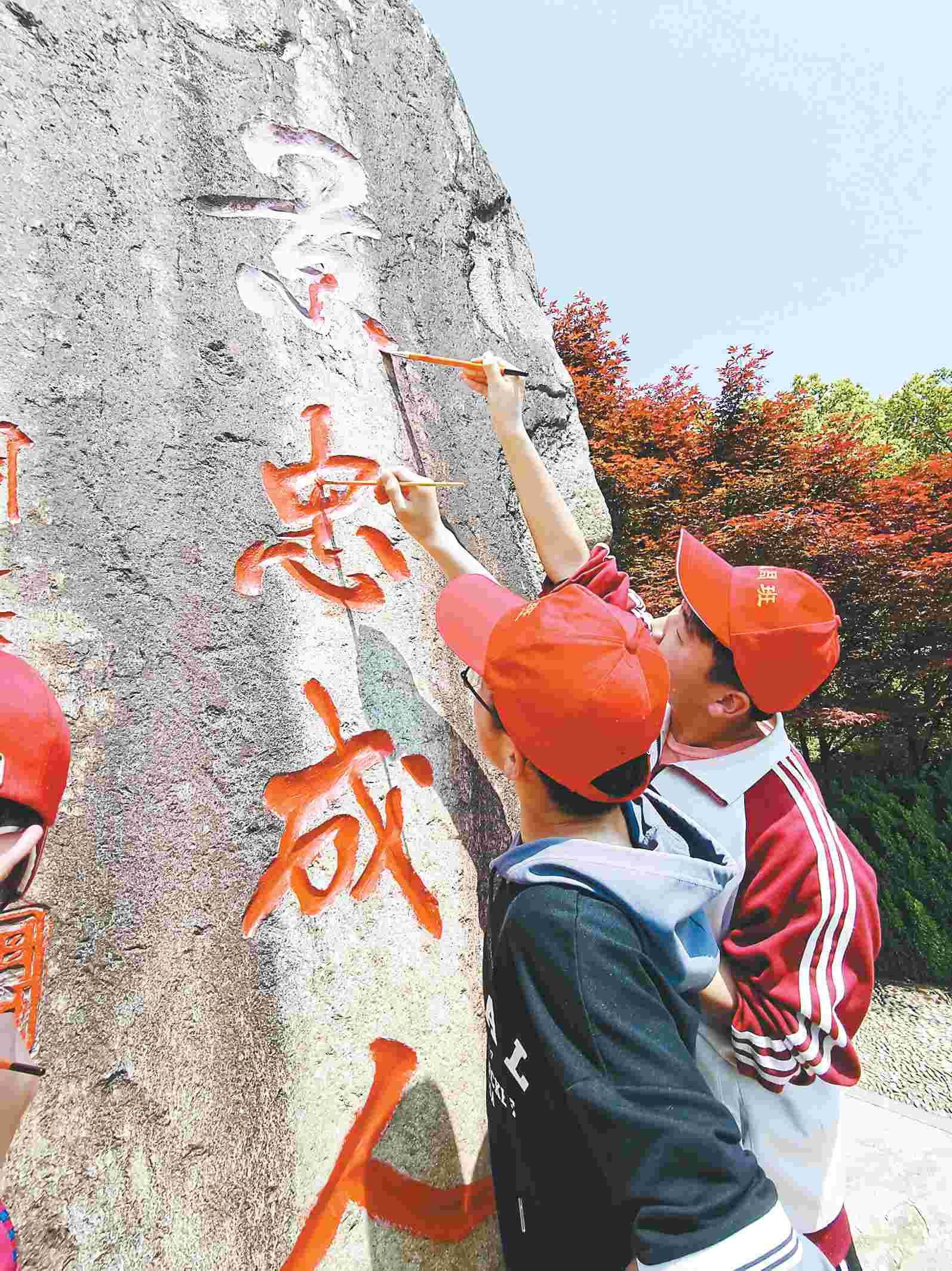 图为学生志愿者为“校训石”描红。 野寨中学供图