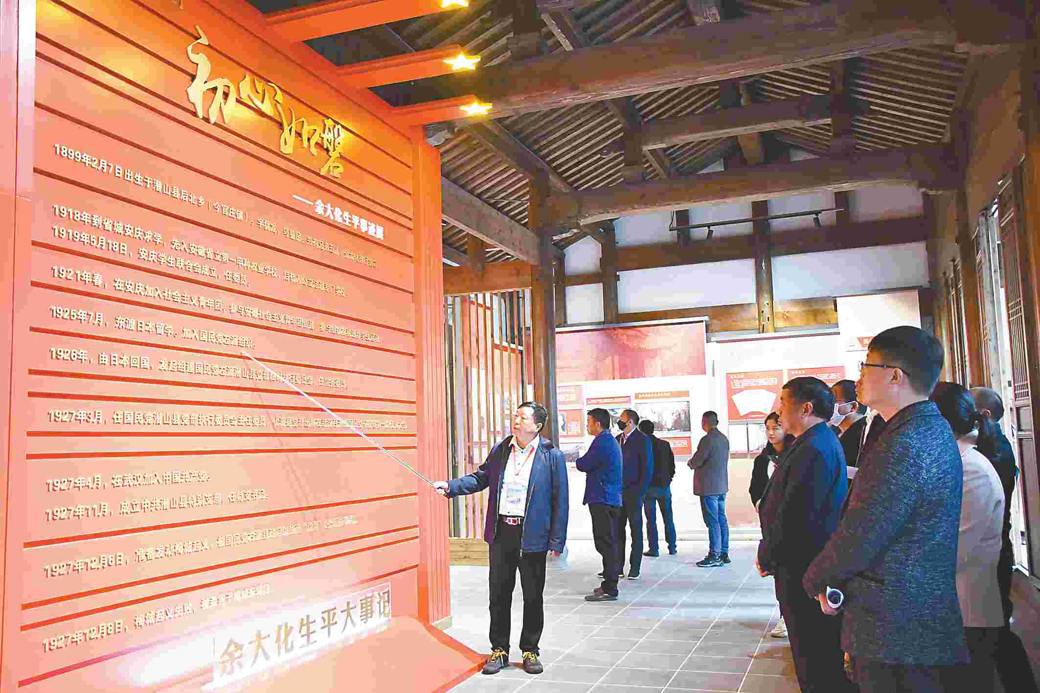 潜山市深入挖掘和保护当地红色资源,做好“红源潜山”品牌,建成一批革命教育基地,吸引了一批批干部群众前来重温红色历史,缅怀革命先烈,传承革命精神,弘扬红色文化。图为党员干部在余大化故居参观。李宝林 摄