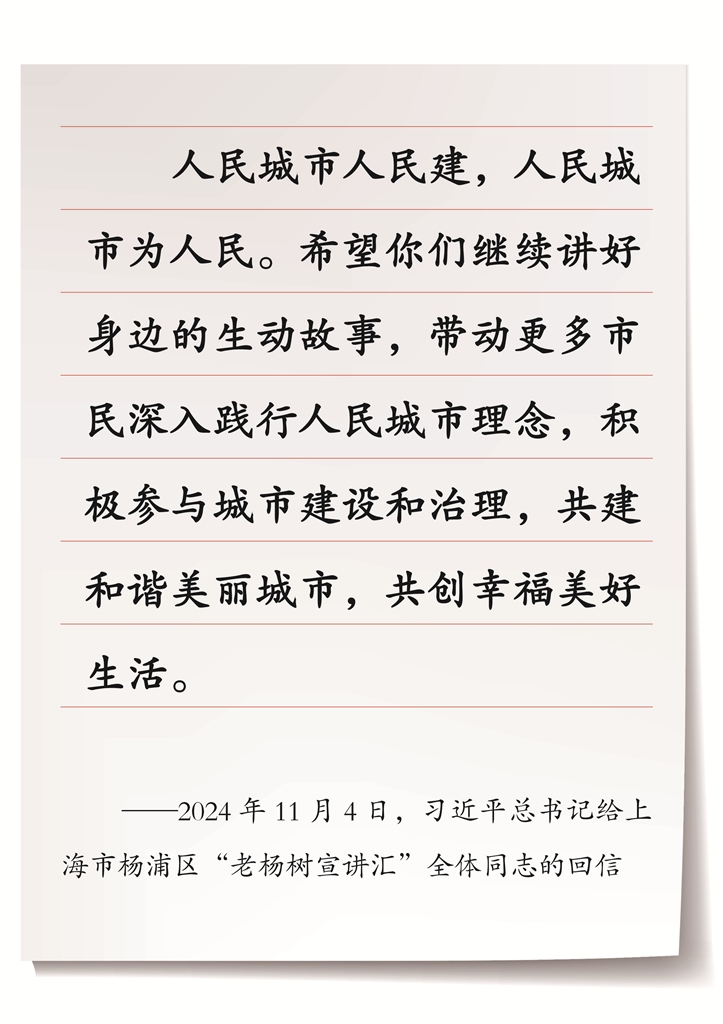 “人民城市人民建,人民城市为人民。希望你们继续讲好身边的生动故事,带动更多市民深入践行人民城市理念,积极参与城市建设和治理,共建和谐美丽城市,共创幸福美好生活。”前不久,习近平总书记给上海市杨浦区“老杨树宣讲汇”全体同志回信,对他们表示亲切问候并提出殷切希望。
