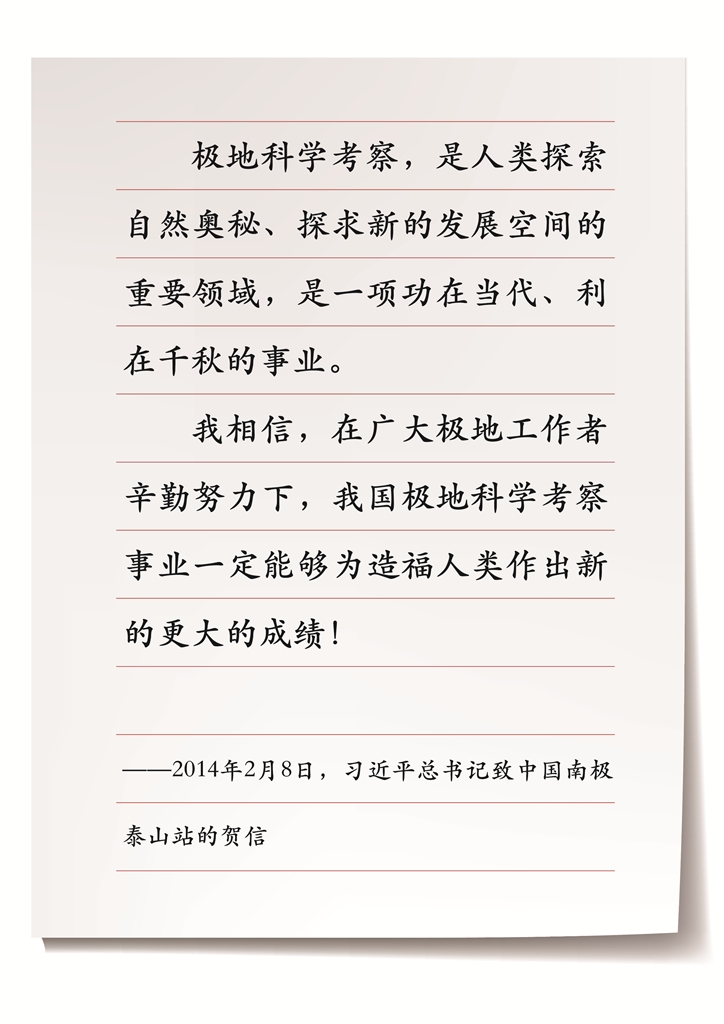 2014年2月8日,在中国南极泰山站建成并投入使用之际,习近平总书记致信祝贺:“极地科学考察,是人类探索自然奥秘、探求新的发展空间的重要领域,是一项功在当代、利在千秋的事业。”“我相信,在广大极地工作者辛勤努力下,我国极地科学考察事业一定能够为造福人类作出新的更大的成绩!”