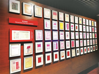 在党章历程专题展厅,一面火红的党章陈列墙令人眼前一亮。墙上以党章形成的时间为序,展出了不同时期、不同版本的党章,集中反映了中国革命、建设和改革事业的进程。