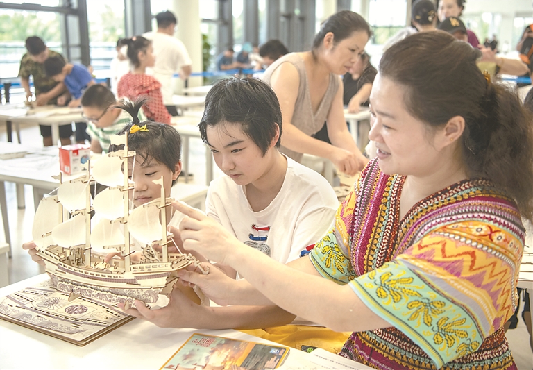 暑期以来,众多家长和小朋友在赶海季来到海南省琼海市中国(海南)南海博物馆,感受航海历史文化。图为近日,小朋友和家长在博物馆拼装船模。 图片来源:视觉中国