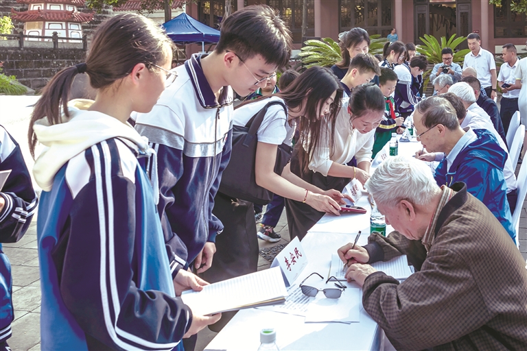 图为四川省资阳市安岳县秦九韶纪念馆“数学科普教育基地”授牌仪式现场,院士给参加活动的师生签名。图片来源:视觉中国