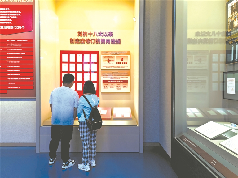 6月18日,中国共产党历史展览馆开馆三周年。图为近日,观众在党的十八大以来制定或修订的党内法规展板前驻足参观。李灵娜 摄