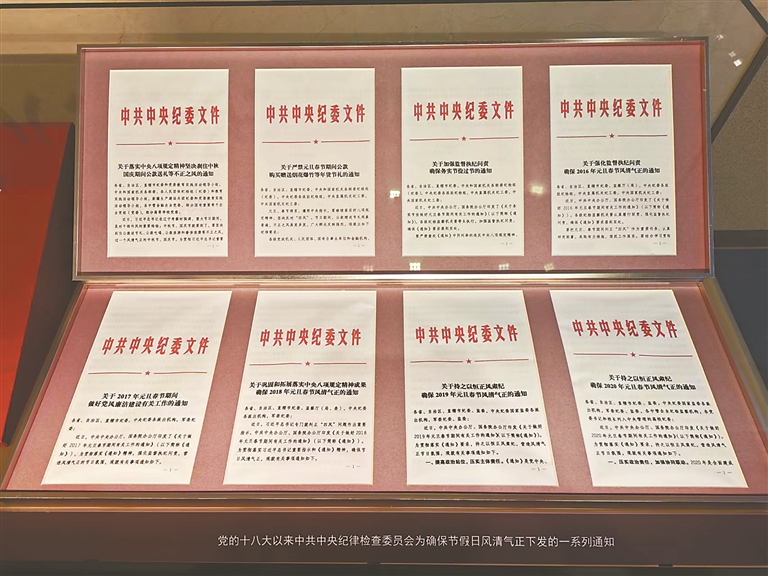 在主题展览第四部分——“推进中国特色社会主义进入新时代,全面建成小康社会,开启全面建设社会主义现代化国家新征程”的展品中,不仅有习近平总书记在地方考察缴纳伙食费的票据和在招待所用餐时的点菜单,还有中央八项规定、党的十八大以来制定或修订的党内法规等展板,还可以看到党的十八大以来中共中央纪律检查委员会为确保节假日风清气正下发的一系列通知。