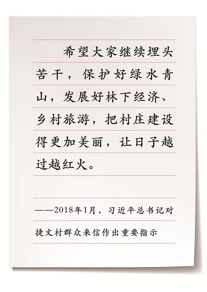 2018年1月,习近平总书记对捷文村群众来信作出重要指示:“希望大家埋头苦干,保护好绿水青山,发展好林下经济、乡村旅游,把村庄建设得更加美丽,让日子越过越红火。”