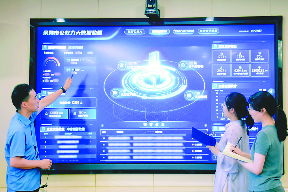 浙江省余姚市纪委监委利用公权力大数据监督应用,打通该市现行招投标系统业务数据接口,对交易数据开展实时的“嵌入式”监督。图为近日,该市纪委监委干部对预警信息开展分析研判。 饶帆帆 摄