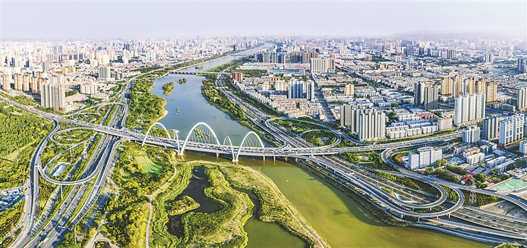 山西省太原市的汾河景区湿地公园风光如画,与北中环桥交相辉映。 米国伟 摄