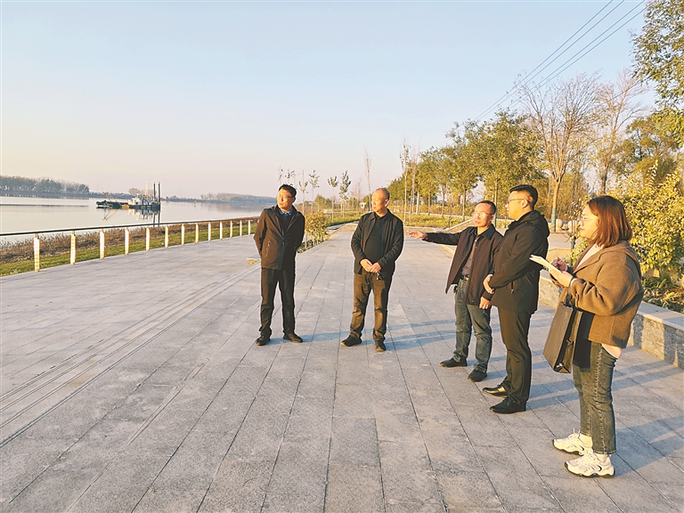 11月初,山西省晋中市平遥县纪委监委工作人员来到汾河百公里中游示范区平遥段项目现场,向项目施工方了解干部作风、工程进展等情况。李灵娜 摄