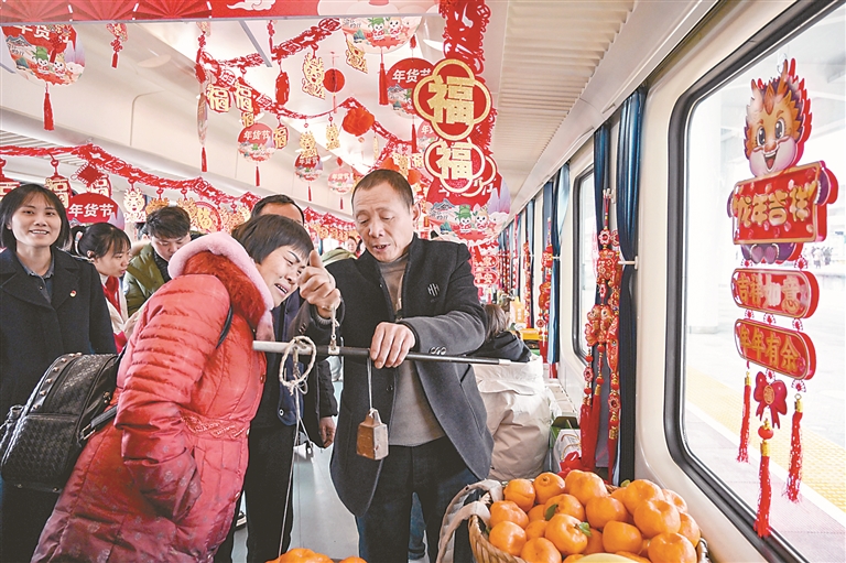 近期,中国铁路成都局集团有限公司联合重庆铁路公安处、贵州省桐梓县文化旅游局等部门,在遵义往返重庆西的5630\5629次列车上举办“年货集市”,旅客在列车上“逛年货”、品尝“年夜饭”、欣赏非遗文化表演,感受浓浓年味。图为2月5日,在遵义开往重庆西的5630次列车上,旅客购买沿线村民售卖的农产品。新华社记者 黄伟 摄