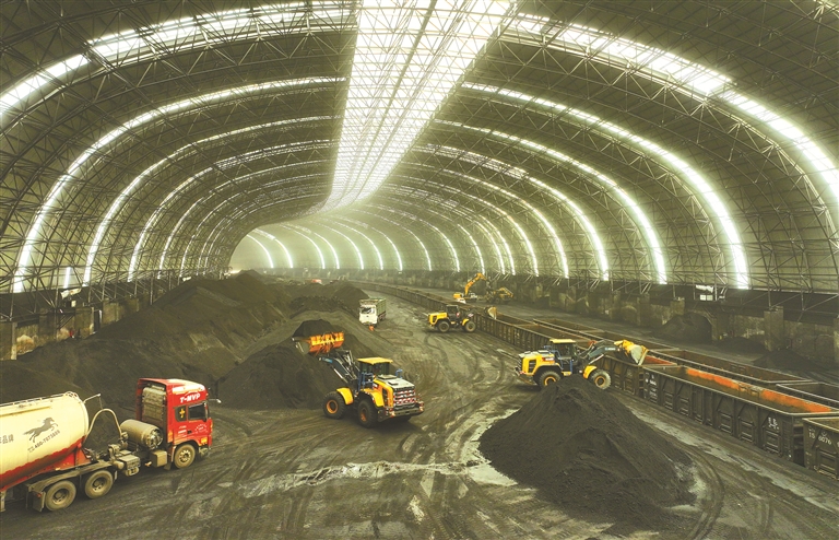 图为近日,河北省石家庄市井陉县,储备基地环保大棚内机械设备正在进行煤炭装车作业。 图片来源:视觉中国