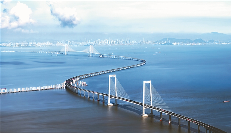 连接广东深圳至中山的深中通道,是粤港澳大湾区内部融合发展的标志性工程之一,该项目通车后,珠江口东西两岸的深圳市和中山市将进入“半小时生活圈”,进一步促进粤港澳大湾区城市群的互联互通。图为跨越万顷碧波的深中通道。 图片来源:视觉中国