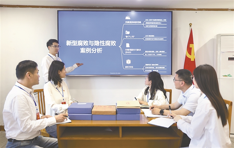 图为近日,广东省广州市花都区纪委监委案件审理室工作人员就该省某技术中心原主任林某彬案进行集中讨论,分析行贿人代持情节。樊玉春 摄