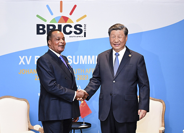 当地时间8月24日上午,国家主席习近平在约翰内斯堡出席金砖国家领导人会晤期间会见刚果(布)总统萨苏。
