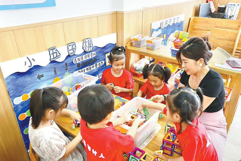 图为8月15日,山东省青岛市西海岸新区王台街道徐村幼儿园,孩子们在玩耍。(图片来源:视觉中国)