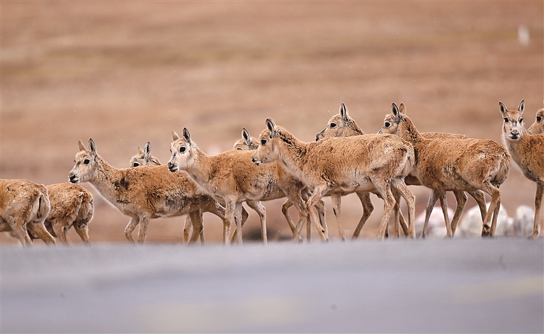 图为在三江源国家公园,一群待产雌性藏羚羊在通过青藏公路前往可可西里卓乃湖产仔。 新华社记者 张宏祥 摄