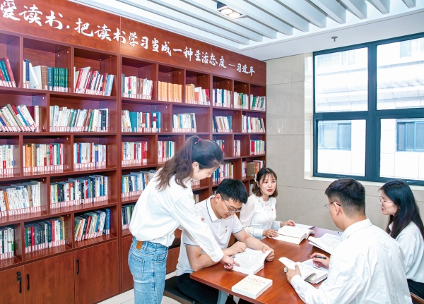 学习贯彻习近平新时代中国特色社会主义思想主题教育开展以来,广大党员、干部坚持读原著学原文悟原理,系统全面学习习近平新时代中国特色社会主义思想。图为近日江苏省徐州市云龙区纪检监察干部在图书角开展读书学习交流。张俊哲 摄