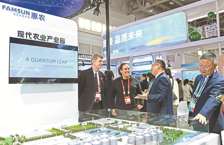 11月28日,首届中国国际供应链促进博览会在京开幕。图为参展商与参会嘉宾在绿色农业链展区交流。新华社记者 蔡湘鑫 摄