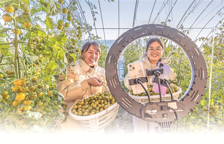 1月10日,江苏省泗洪县花庄社区蔬果种植基地里,党员志愿者直播团队正为果农推销圣女果,助力新年销售。图片来源:视觉中国