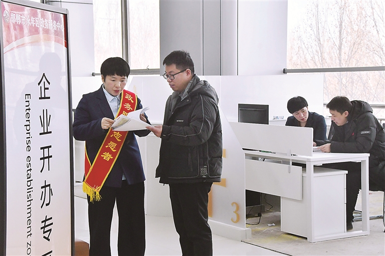 河北省邯郸市以“高效办成一件事”为抓手,为办事企业、群众提供政策咨询、网上申报、全流程跟踪等服务。图为党员志愿者在永年区行政审批局指导群众办理企业开办业务。图片来源:视觉中国