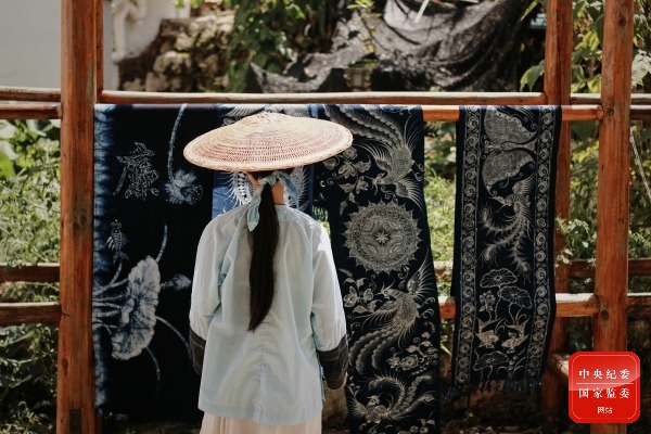 贵州省贵阳市花溪区龙井村把豆染、刺绣等民间技艺融入清廉乡村建设,寓廉意于蓝布之上,在豆染作品中融入廉词、廉句、廉花。图为非物质文化遗产豆染技艺传承人制作的“廉”文化产品。(贵州省贵阳市花溪区纪委监委供 梁恩齐 摄)