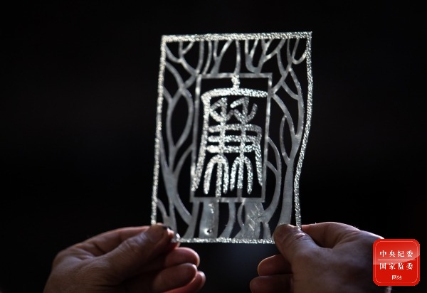浙江省永康市纪委监委积极引导相关部门或民间组织,在铜雕、锡雕等非物质文化遗产中融入廉洁文化元素。图为工匠正在展示经过千锤百炼的锡雕“廉”作品。(浙江省永康市纪委监委供 叶文彬 摄)