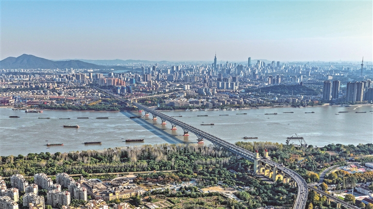 水运连着国运,江河滋养文明。党的十八大以来,以习近平同志为核心的党中央以长江、黄河两大流域发展战略为主体架构,将经济社会高质量发展和生态环境高水平保护相结合,在实践中不断完善和发展新时代江河战略。图为近日拍摄的长江南京段和南京长江大桥,江面百舸争流,江畔美景如珠链铺展(无人机照片)。 新华社记者 李博 摄