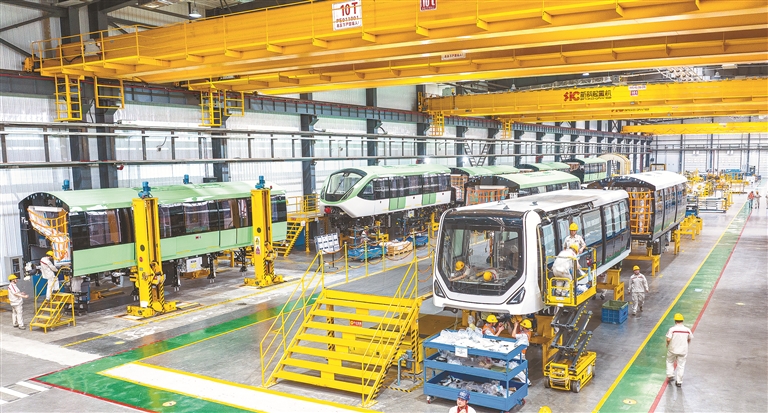 安徽省芜湖市抢抓高质量发展新机遇,加快发展新质生产力,积极培育轨道交通产业链集群。图为该市经济技术开发区某公司车间,工人在生产无人驾驶轨道交通列车。图片来源:视觉中国