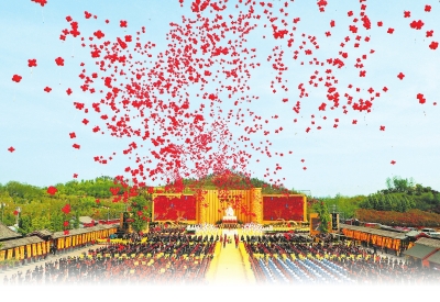 4月14日,辛丑年黄帝故里拜祖大典在郑州市新郑黄帝故里景区隆重举行。图为彩球腾空,拜祖大典现场一片沸腾。本报记者 邓放 摄