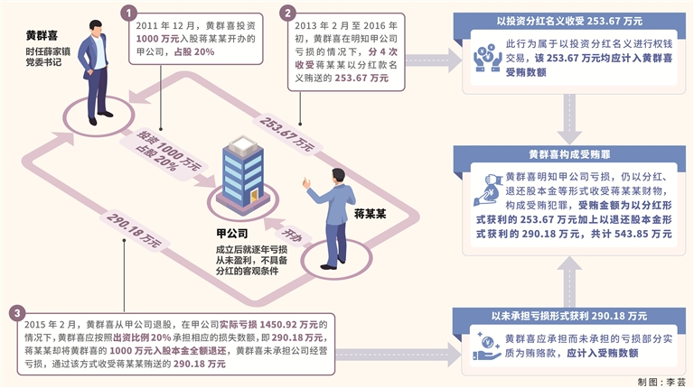 2009年至2022年,黄群喜利用担任薛家镇镇长、党委书记等职务上的便利,在土地使用权出让等事项上为甲公司负责人蒋某某提供帮助。2011年12月,时任薛家镇党委书记的黄群喜以其儿子黄某的名义投资1000万元入股甲公司,占股20%。2013年2月至2016年初,黄群喜在明知甲公司亏损的情况下,通过分红、退还股本金等形式收受蒋某某给予的543.85万元。其中,2013年2月至2016年初,黄群喜分4次收受蒋某某以分红款名义贿送的253.67万元;2015年2月,黄群喜从甲公司退股,在甲公司实际亏损1450.92万元的情况下,蒋某某将黄群喜的1000万元入股本金全额退还,黄群喜未承担公司经营亏损,通过该方式收受蒋某某贿送的290.18万元。