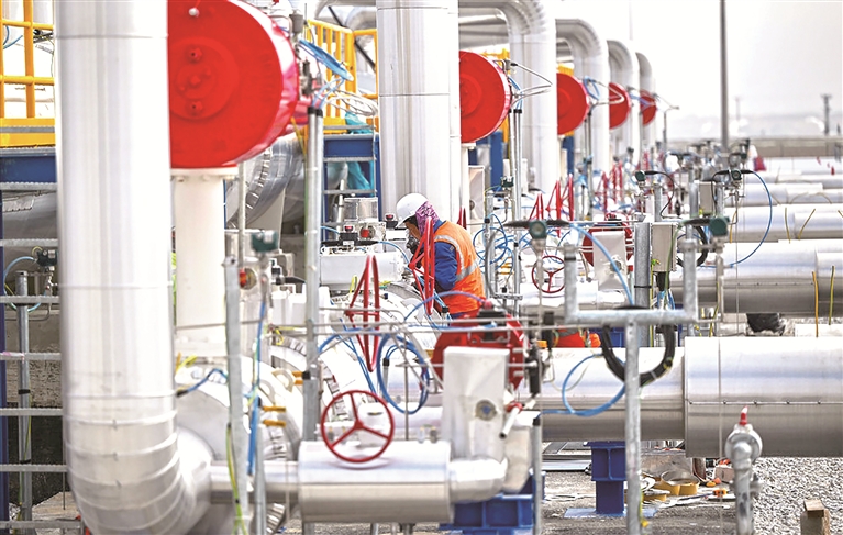 近日,中国企业承建的土耳其图兹湖地下天然气储库扩建项目核心工程完成机械竣工。该项目建成后,将大幅提高土耳其天然气运储能力,助力当地绿色低碳转型,实现经济发展与环境保护的双赢。图为工人在该项目地面场站作业。 新华社发