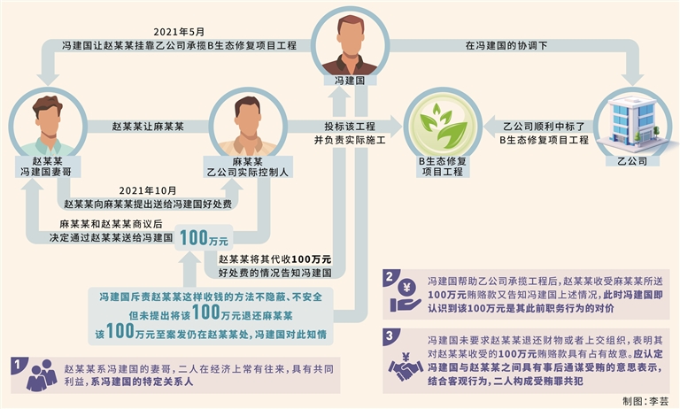 2021年5月,冯建国欲帮助其妻哥赵某某(另案处理)承揽B生态修复项目工程,让赵某某挂靠乙公司进行投标。赵某某未告知冯建国自己无暇承揽工程的实情,便让乙公司实际控制人麻某某投标该工程并负责实际施工,在冯建国的协调下,乙公司顺利中标了B生态修复项目工程。2021年10月,赵某某向麻某某提出送给冯建国好处费,麻某某和赵某某商议后,决定通过赵某某送给冯建国100万元。当晚,赵某某将其代为收受100万元贿赂的实情告知了冯建国,冯建国对赵某某收受该100万元不排斥不反对,未提出将该100万元归还麻某某,只是斥责赵某某这样收钱的方法不隐蔽、不安全,赵某某遂让家属将该笔款项存于银行,等过段时间再找个合适的方式交给冯建国。后因冯建国和赵某某先后被监察机关立案调查,该100万元至案发仍在赵某某处,冯建国对此知情。