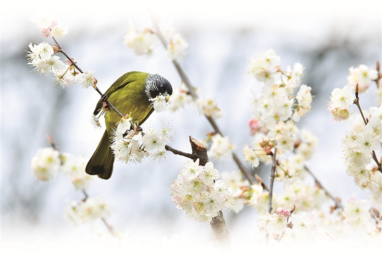 2月28日,贵州省毕节市金沙县化觉镇乌江南岸前顺村,鸟儿在花丛中觅食。 图片来源:视觉中国