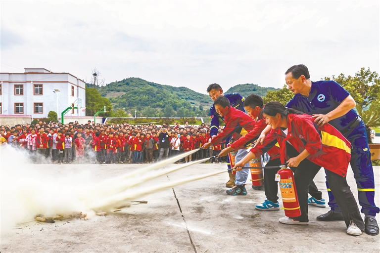 近日,各地开展形式多样的防灾减灾知识普及和应急疏散演练等活动,提高人们应急避险与安全自救能力。图为蓝天救援队队员在贵州省黔西市锦星镇第二小学指导学生使用灭火器。 新华社发(范晖 摄)