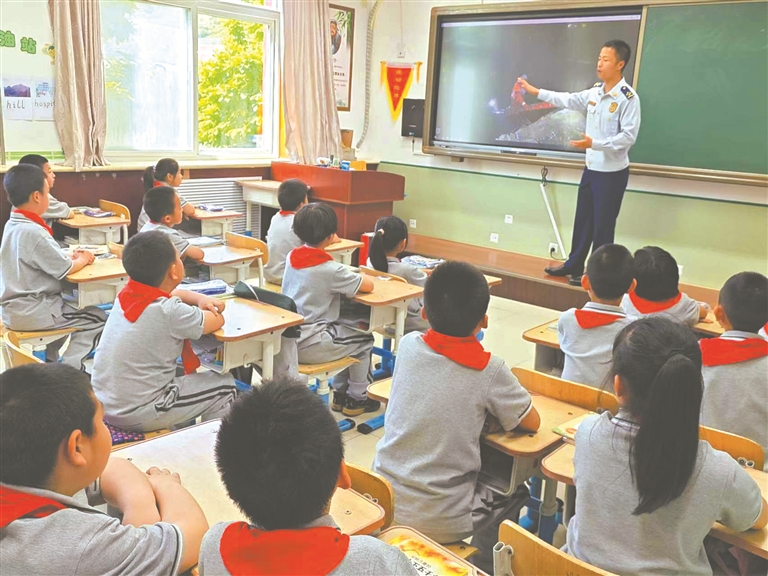 上午9点整,安全课堂——“身边的英雄”开课。来给学生们上课的,正是参与过“23·7”抗洪抢险行动的门头沟区潭柘寺消防救援站指导员李战坤。潭柘寺消防救援站刚获得“中国青年五四奖章集体”荣誉。