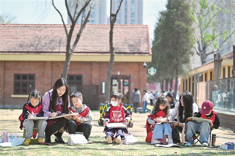 近年来,天津坚持以人民为中心推进城市更新。曾经的天津市第一机床总厂如今改造更新为泰达·津一产业公园,为市民带来全新的休闲消费体验。图为4月6日,老师带着学生来到这里写生。新华社发