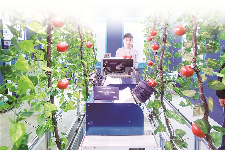 “投资于人”能更好激发创新活力。图为全球高校科技成果转化促进大会上,北京工业大学科研团队带来的番茄智能交互采摘机器人进行自动采摘演示。图片来源:视觉中国