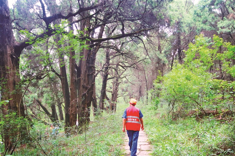 四川省广元市剑阁县翠云廊的古柏林内,生态护林员正在进行日常巡护。陈姝宇 摄