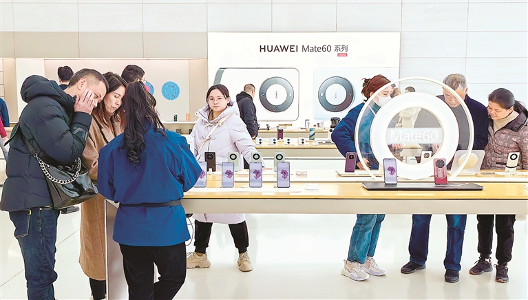 在美国的科技围剿下,包括华为公司在内的中国科技企业坚持自主创新,突破技术封锁,有效顶住了美国对我国高科技的封锁打压。2024年第一周,华为手机位列当周中国手机市场销量第一。图为近日,消费者在某华为全球旗舰店选购手机。 图片来源:视觉中国