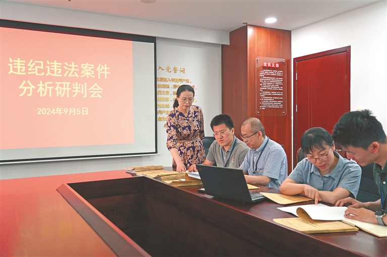 上海市宝山区纪委监委充分运用综合研判机制,加强对违纪违法案件的分析研究,把牢案件处置关。图为该区第四纪检监察室联合案件审理(法规)室对涉嫌违法犯罪党员的党纪处分进行研究讨论。王晓云 摄