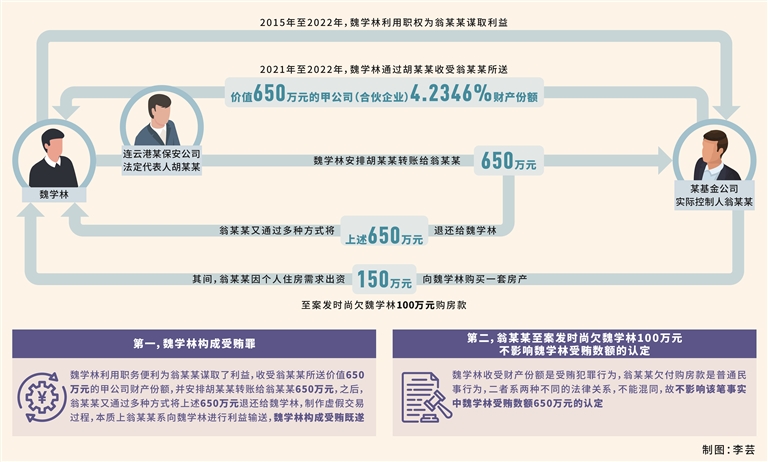 其中,2015年至2022年,魏学林利用职务上的便利以及职权或地位形成的便利条件,本人或者通过其他国家工作人员的职务行为,为翁某某在案件协调等方面提供帮助。2021年至2022年,魏学林通过连云港某保安公司法定代表人胡某某收受翁某某所送价值650万元的甲公司(合伙企业)4.2346%财产份额,其间,魏学林安排胡某某转账给翁某某650万元,之后,翁某某又通过多种方式将上述650万元退还给魏学林。
