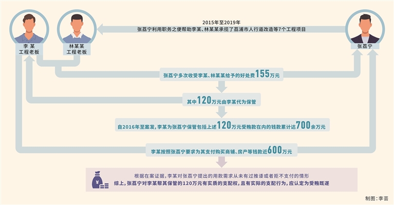综上可以断定,张荔宁对李某帮其保管的120万元有实质的支配权,且有实际的支配行为,应认定为受贿既遂。