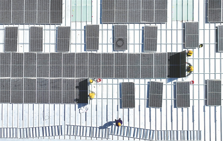工人在河北省唐山市芦台经济开发区一家企业厂房屋顶上安装太阳能光伏发电板。新华社记者 杨世尧 摄