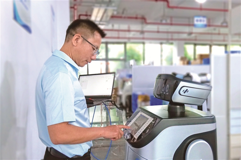 福建省福州市,服务机器人应用技术员谢茂皇正在对机器人产品的功能进行调试。周磊 摄
