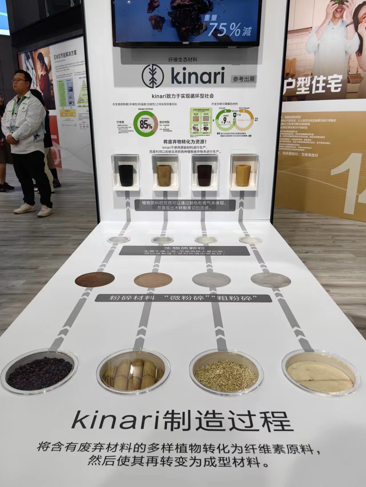 漫步各大展厅,让废弃材料重获新生、变废为宝的展品随处可见。在松下电器展台,分别由咖啡渣、竹子碎、啤酒花、杉木碎四种植物废弃物为原料生产的杯子陈列在展窗内。“聚焦循环经济概念,松下带来首次亮相中国的纤维生态材料kinari。kinari不使用原始材料,而是将废弃物转化为资源,具有良好可回收性。”松下电器中国东北亚公司广报宣传部主管杜祎告诉记者。
