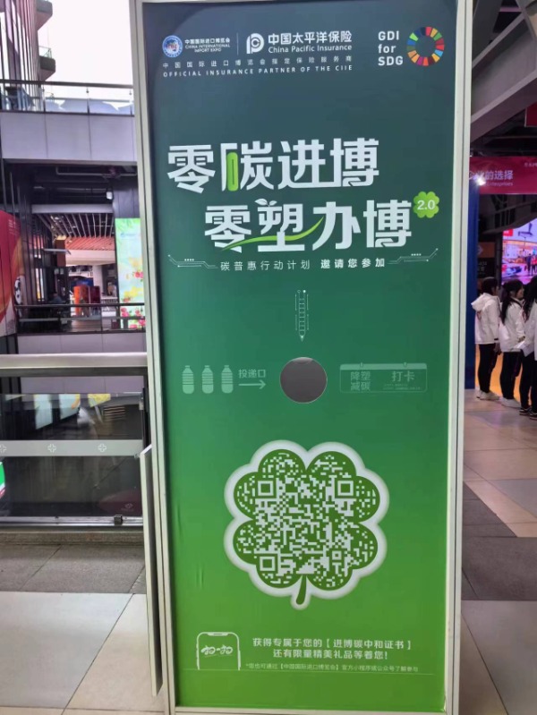 展馆内,一个个由绿色面板组装而成的塑料瓶回收箱十分醒目。箱体印有“零碳进博,零塑办博”标语,标语下方为一个四叶草型的二维码,来往观众通过扫码就可参与活动。