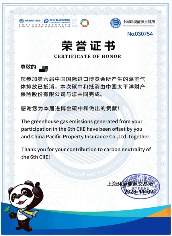 图为通过参与绿色进博活动领取的“碳中和”证书。陈昊 摄